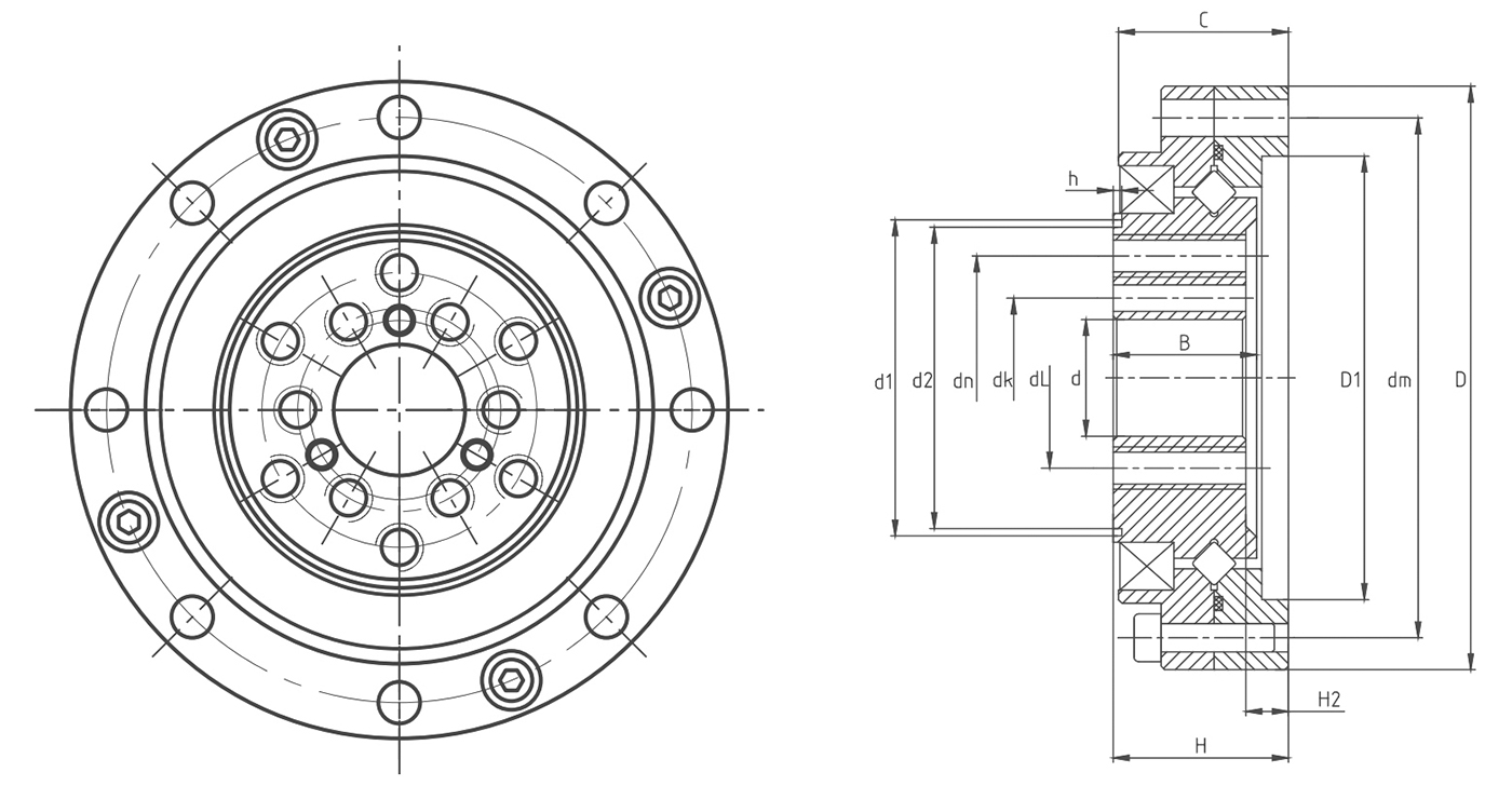 | d | D | H | C | B | H2 | D1 | d1 | d2 | DMで | 取付穴サイズ | DN | 取付穴サイズ | dl | 取付穴サイズ | DK | 取付穴サイズ | Cr | コー | |||